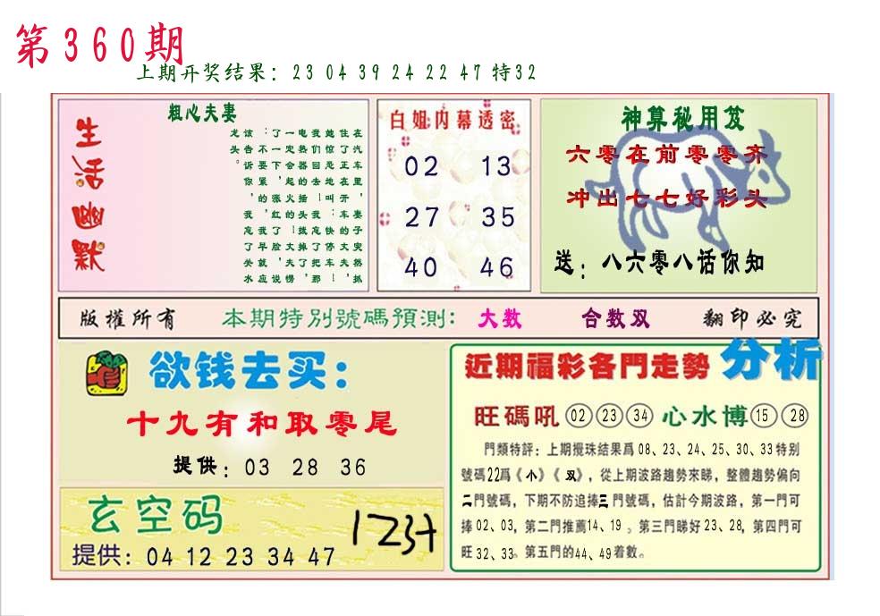 | 358期:澳洲六合彩四尾八码 开????? | |