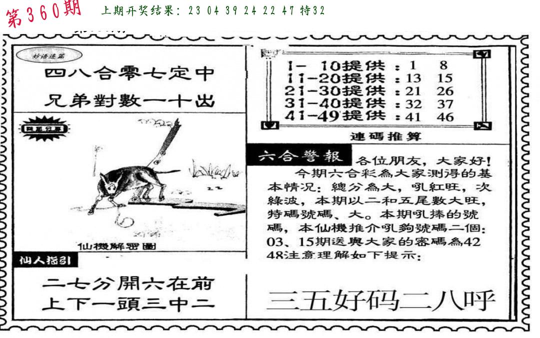 359期【隔壁老胡18码】开32狗 15-25-35-31-19-38 |